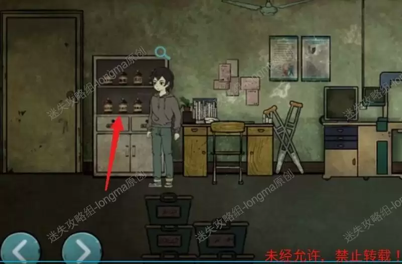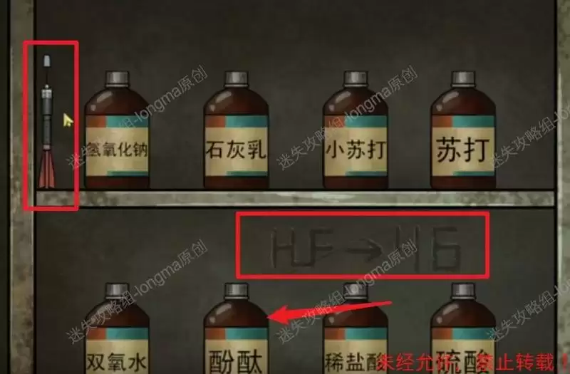 观察左边的柜子,得到【麻醉针】,使用【空滴管】抽取酚酞液体,观察柜子上的提示。