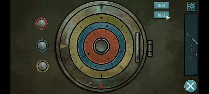站在椅子上打开天花板上的机关,完成小游戏(点击左边按钮,使三个圈子的黑点对应同颜色的指针)。
