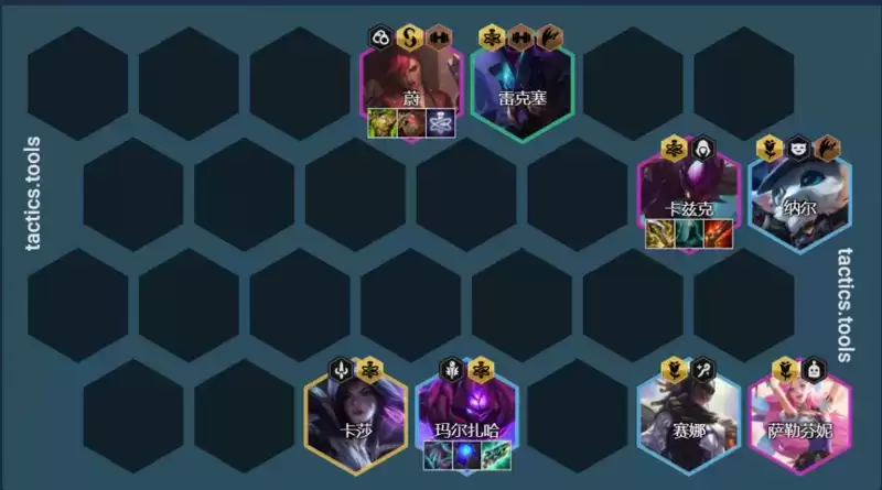 棋子组成:雷克赛、艾克、纳尔、赛娜、萨勒芬妮、蔚、螳螂、卡莎