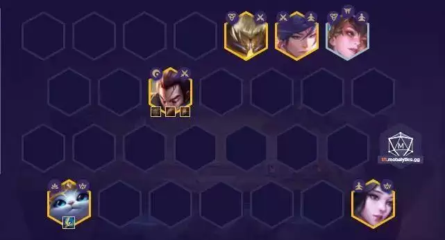 棋子组成:武器(2)、剑姬(1)、刀妹(3)、亚索(1)猫(3)、风女(2)