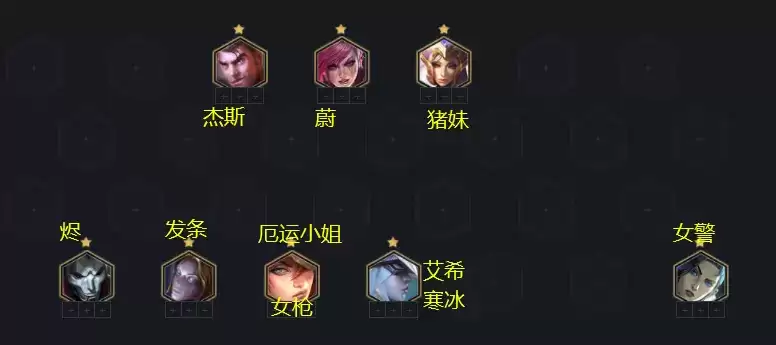 棋子组成:杰斯、蔚、猪妹、烬、发条、女枪、艾希、女警