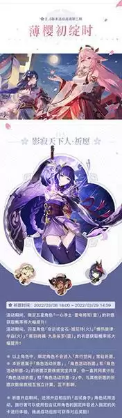 ☆祈愿时间:2022/03/08 18:00- 2022/03/29 14:59活动期间,限定五星角色「一心净土·雷电将军(雷)的祈愿获取概率将大幅提升。