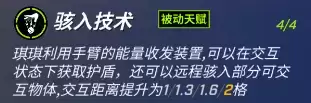 琪琪利用手臂的能量收发装置,可以在交互状态下获取护盾,还可以远程骇入部分可交互物体,交互距离提升为1/1.3/1.6/2格。