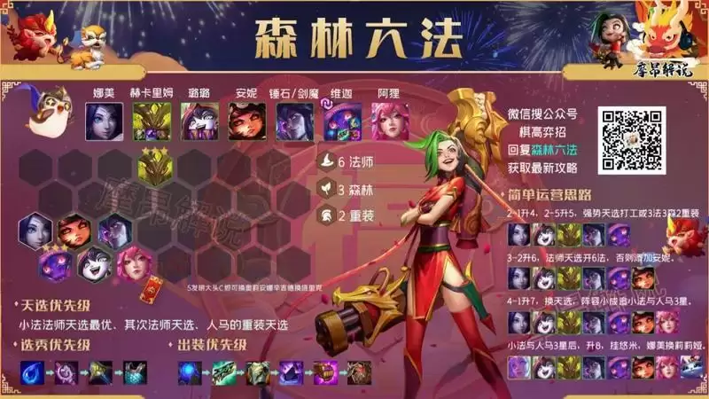 1、阵容主要依靠6法师羁绊与森林羁绊为小法增加法强,特别是法师羁绊能让法师棋子双重施法;