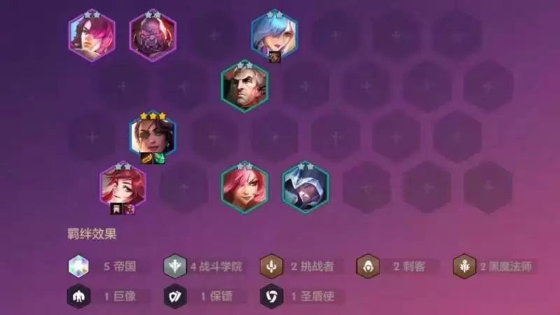 羁绊效果:5帝国 4学院 2挑战2刺客 2黑魔