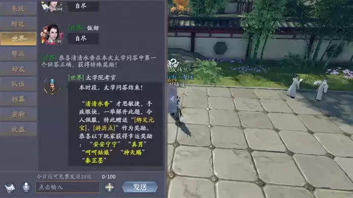 系统每天会在6个时段分别给出一道与原著相关的题目,玩家在世界频道中进行抢答,第一位答对的玩家可获得绑定元宝、铜钱以及游历点,其他参与玩家有机会获得幸运奖励。