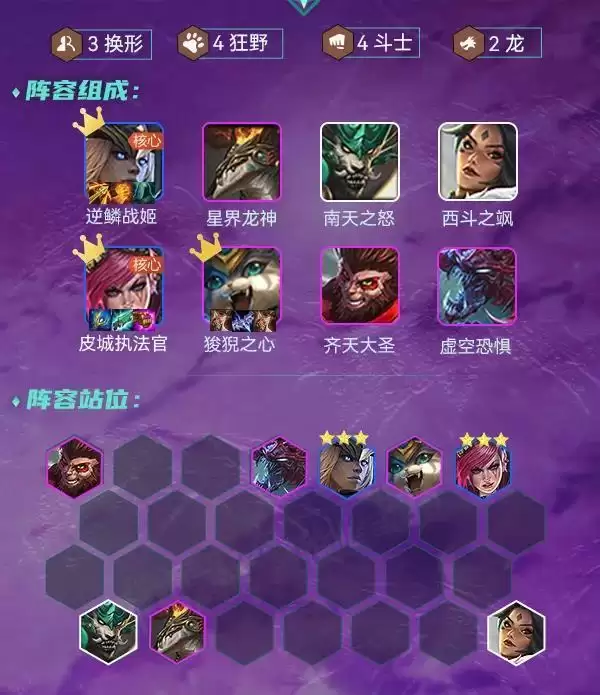 羁绊效果:3换形、4狂野、4斗士、2龙