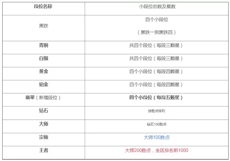 手游里面是分成10个段位,按级别从低到高分别为黑铁,青铜,白银,黄金,珀金,翡翠,钻石,大师,宗师,王者,而且每个段位里都是有分4个小段位。
