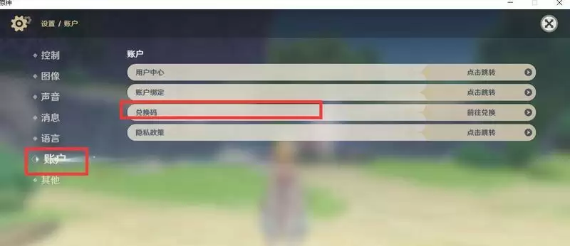 3、在设置的界面中点击账号,并且选择兑换码选项;