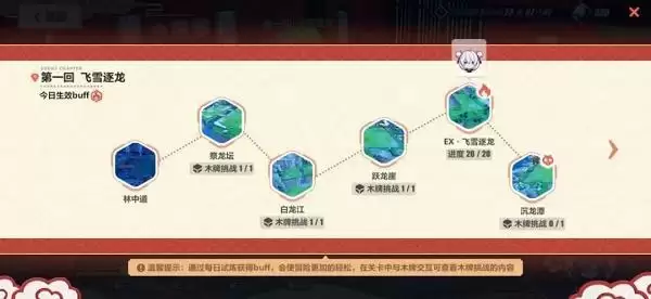 在EX关卡中我们每通关数层就会获得一个增益buff,重复获得同一种增益还能进行升级。一般我们初次挑战一个章回的EX关卡时,往往会因为人物等级偏低而较难完整通关,打完每日试炼赠与的三个增益buff能够帮助咱们轻松不少。
