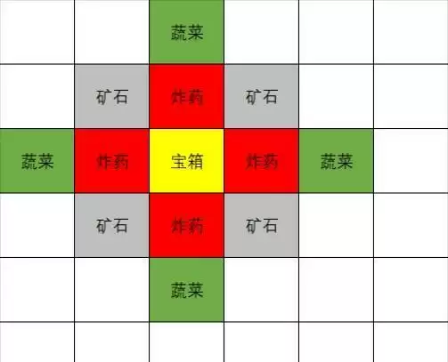 ※注意:宝箱也有可能会放在边缘,那周围只会围3个炸弹。炸药也有可能会单独存在(不围着宝箱),比如上下左右4格蔬菜围1格炸药。
