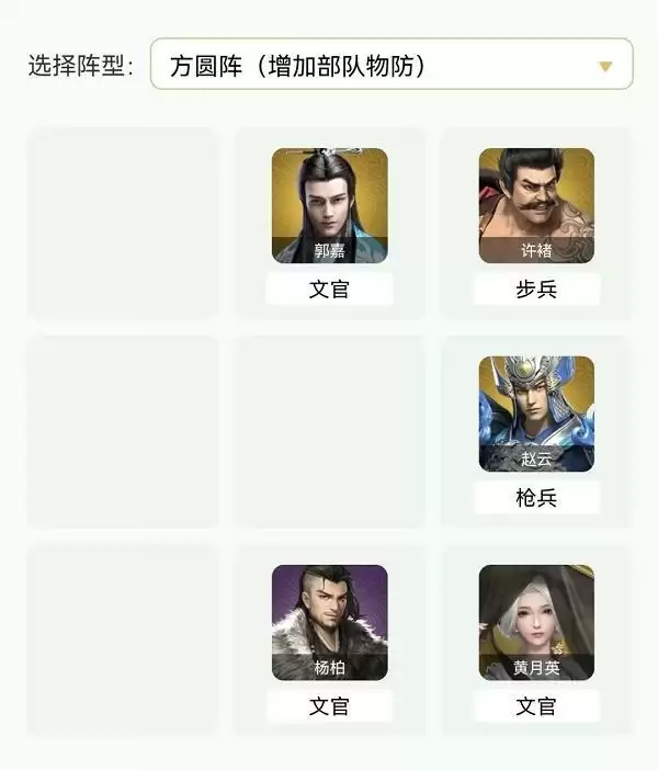 此阵容比较完美,常见于pvp,但在大家防御类装备没有精炼起来,群秒队大行其道的当下,难有上场机会。五个连续武将(释放技能后恢复自身100士气),以及郭嘉与杨柏的双控制优势,可以连续钳制敌方部队。