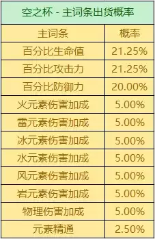 可以看到,主词条里面百分比生命值、百分比防御力、百分比攻击力这3个属性是最容易出货的。而最难出货的是元素精通,在3个部位里面都是垫底。在所有部位里面,想刷出一个主词条是元素精通的杯子是最难的,概率只有2.5%。