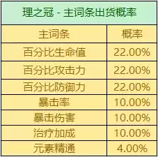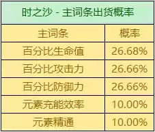 关于圣遗物各个主词条和副词条的出货概率,跟圣遗物5个位置有关,其中生之花的主词条必定是固定生命值,死之羽主词条必定是固定攻击力,这2个部位就没有什么好说的。而剩下的时之沙、空之杯、理之冠这3个部位,主词条的出货概率如下: