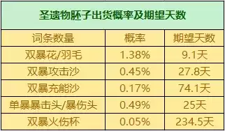 圣遗物之所难刷,除了本身掉落概率的问题,其次就是因为大家都对自己圣遗物要求比较高,在主词条对的情况下,大家都希望要求副词条带有双暴。这里给大家计算了带双暴副词条的圣遗物胚子以及期望天数(按每天160树脂):