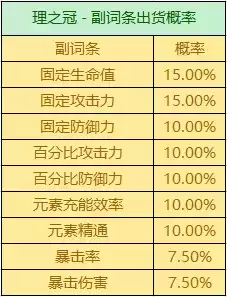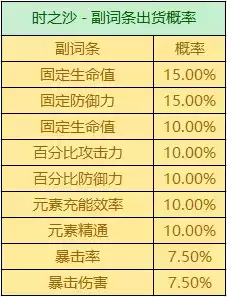除了主词条外,圣遗物的副词条出货概率也是有所不同的。由于圣遗物的主词条属性不能和副词条完全相同,因此这里的时之沙、空之杯、理之冠选择的是百分百生命值为主属性的。