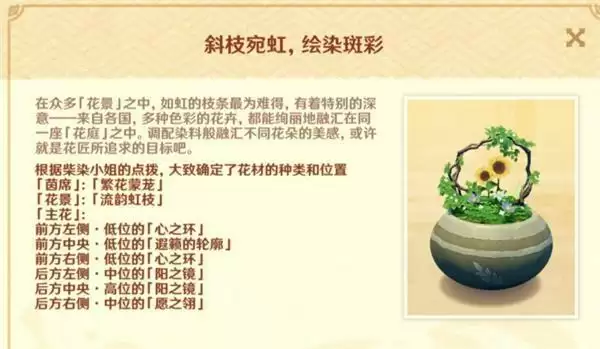 今天的「花题」是斜枝宛虹,绘染斑彩,听起来同样富有诗意呢。上图是游戏里的提示,我们可以参考它来装饰花盆。