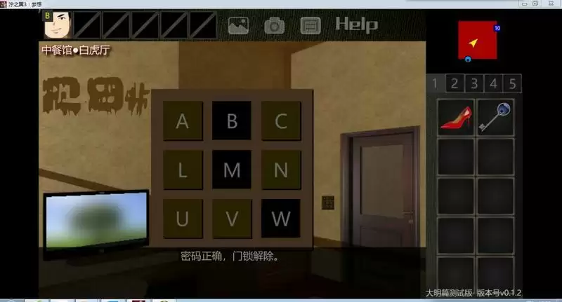 15.回到走廊,查看机关,根据线索“A=H T=I”的提示,我们可以得知,字母需要加工才可以得到答案,现在我们得到的字母线索只有“BMW”,而加工,即为去掉字母的上半部分,所以密码即为DIVIVV