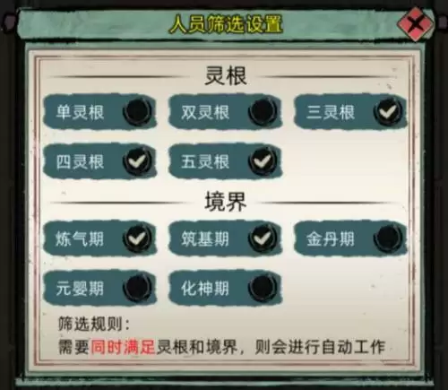 2、人员设置。前期选练气筑基,后期可以加上金丹。灵根方面我一直是让三四五灵根当工具人,在前期修炼类功法较少的情况下这类工具人进阶金丹的可能性相对小,适合当工具人。当然也可以看天赋,有nb天赋的杂灵根也是容易进阶的,就不展开讲了。