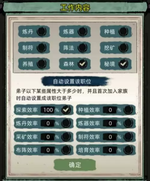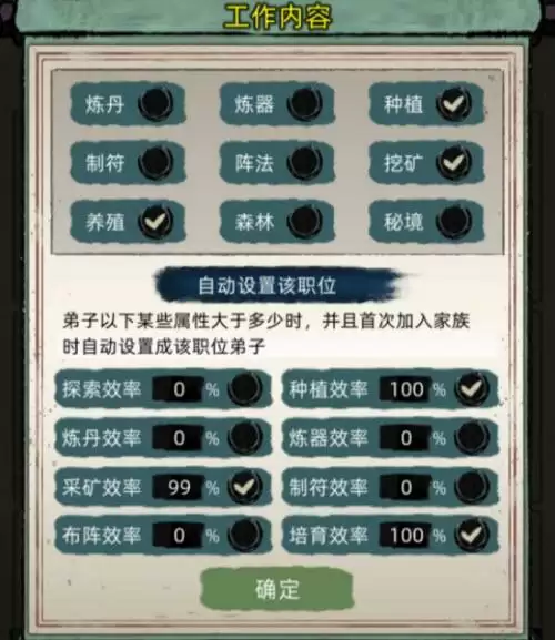 1、首先是弟子工作设置,先勾选需要自动派遣工作的类别,前期就是挖矿养殖森林秘境,种田流前期田少的时候也可以把种植选上,后面田多了勾选的性价比就不高了可以再去掉。勾选造成后设置自动检测空闲弟子时间,一般都是选1年间隔。