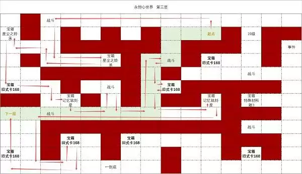 1、永恒心世界第三层图形较为复杂,而且地图也比较大,玩家可以参考上图的路线进入第四层。