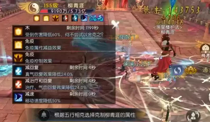 BOSS周围会出现5个光圈,代表5种五行属性,且BOSS头顶会出现一种五行属性,受到伤害降低60%,根据BOSS的属性选择克制的光圈,可以不受影响。BOSS每隔一段时间会释放该技能,释放时会刷新BOSS的属性,且清除玩家的属性。