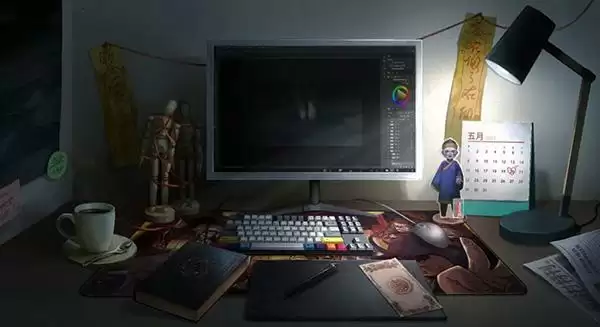 首先是在台灯下的日历,上面的日期(5月20日)用红色圈了起来,然后就是彩虹键盘和显示器中的红鞋元素等。