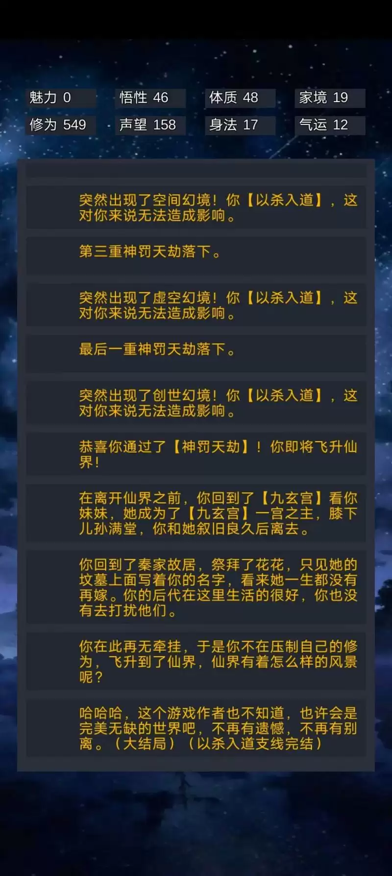 正反双线终于通关,修炼天才(+4修为)+创世者(元婴后+2修为+其他属性)必选,没有直接凉凉。