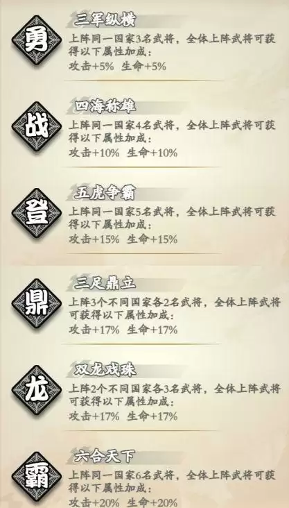 首先我们先来看看我们武将阵营的光环,大家可以看到最强的光环是我们六个同一阵营的“六合天下光环”。但是,不推荐大家前期强行去凑这个光环羁绊,前期在同一阵营武将比较匮乏的情况下,还是比较推荐属性一样不差的“三足鼎立光环”,这样可以很好配合我们前期武将最大化获取前期的资源啦。