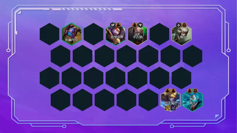 2阶段:2-1拉4人口,2-5拉5人口,前期建议走连胜过渡运营,根据前期打工卡牌的数量来决定过渡的思路,这里优先推荐走发明家体系过渡,EZ拿德莱文的装备,搭配极客羁绊前期打工能力非常强。