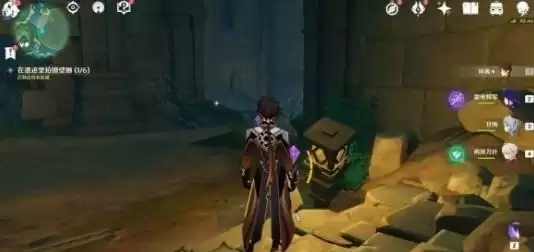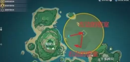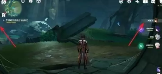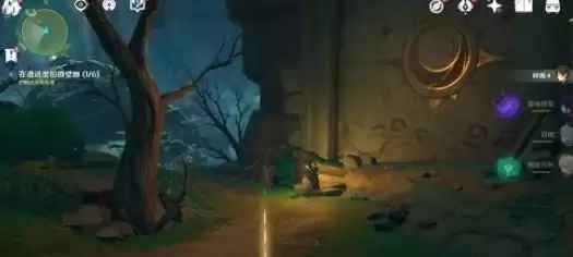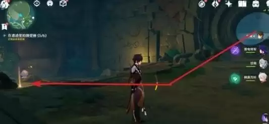 然后顺着路走到底,进入雷指针解密的房间。顺着树根的方向抬头看,就可以看见壁画了,但出现绿色提示,拍摄即可(用派蒙相机就行了)。