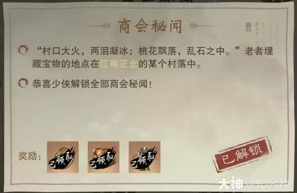 “村口大火,两泪凝冰;桃花飘落,乱石之中。”老者埋藏宝物的地点在江南正北的某个村落中。