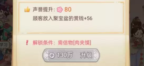 游戏中玩家们提升了声誉以后,那么玩家们可以提升相关的商品,玩家们在升级4级展示台以后,那么玩家们需要获取到信物肉夹馍,在使用130万的金币以后就可以升级了。