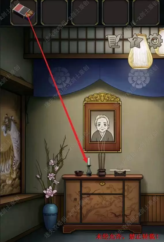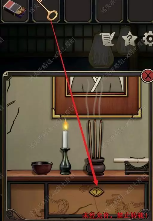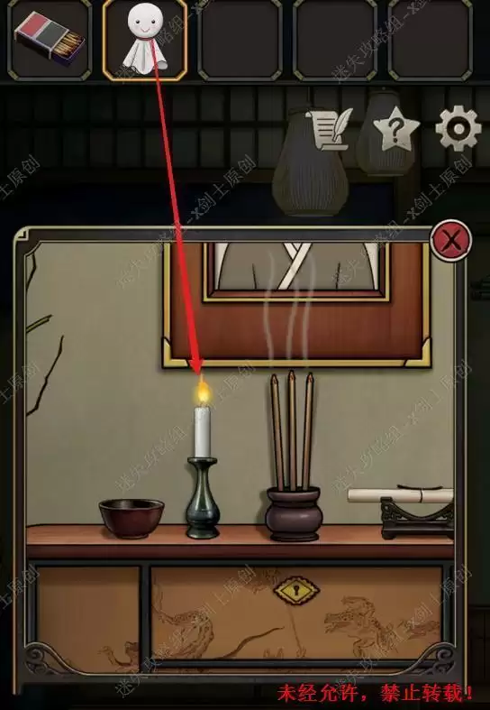 1.在游戏一开始跟着提示点击台子,在台子上面可以找到火柴,是用火柴点燃蜡烛。1.1