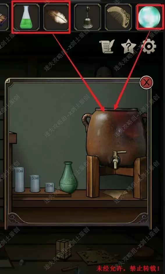 30.点击旁边的水缸,将羽毛,珠子还有药水一起放到缸中,这时候会进行一个小游戏来制作醒酒水,玩法是调处40ml的药水。这里如视频所示30