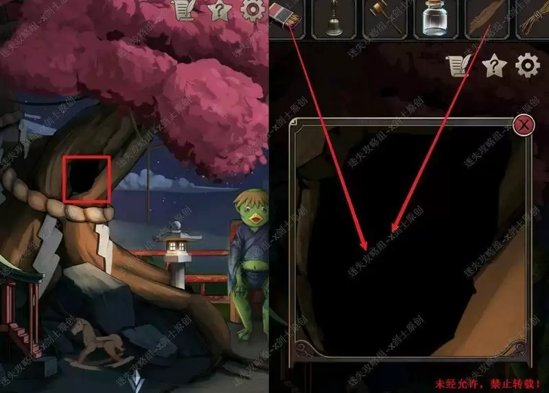 41.点击树洞,将旧木柴还有火柴放进去,就可以照亮树洞里面了。摇响铃铛之后蝙蝠就会离开就剩下一个眼睛,点击就可以获得眼珠了。41.1.2.3