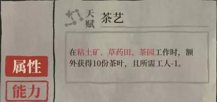 天赋:在黏土矿、草药田、茶园工作时,额外获取10份茶叶所需工人减少一位