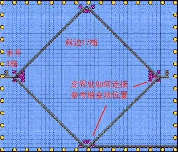 3.菱形矿道的四个边需要17格轨道,左右两端需要搭建水平三格的矿道。搭建要点在于要讲两端的尽头用锤子敲成一个会将矿车回弹的弹簧型桩子,以及铁轨的连接处也用锤子敲好。保证矿车能在菱形矿道上朝一个方向转圈圈。 在菱形矿道搭好以后,就可以尝试无伤遛猪鲨了。