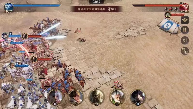 在该玩法战斗中,需要主公们击破敌阵,将对方后方的兵营攻下即算胜利。这里需要注意的是,敌方兵营会持续派出军队迎敌,且敌方的兵营血量越低,召唤出的敌军等级越高。