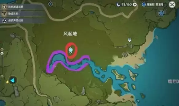 传送到奥藏山右边的传送点,前往北面的河流,沿着紫色路线搜索就可以获取大量的金鱼草