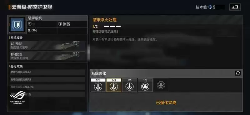 装甲方面我们加点选择:物理抗性提升+附加装甲。这样加点的话是比较常规的,在大多数情况都可以使用,可以极大的提升该战舰的生存空间,假设对方有较多的能量型武器,例如维塔斯这种能量型的轰炸机的话,我们可以将其中的一个附加装甲替换成能量抗性提升。