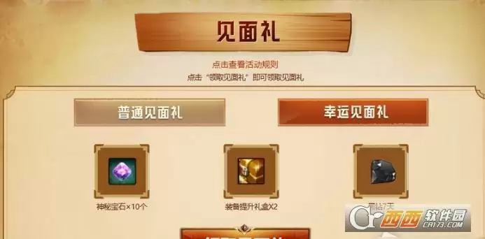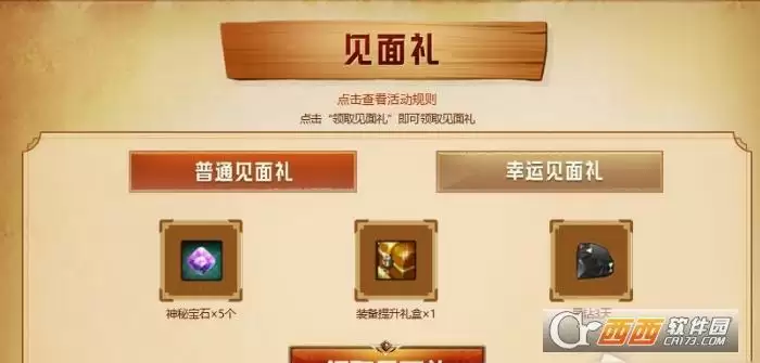 玩家进入活动页面后,即可领取一份见面礼,奖励为5个神秘宝石、1个装备提升礼盒和3天黑钻。