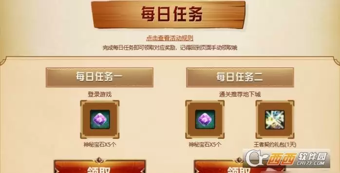 玩家在活动页面中完成每日任务时,可获得神秘宝石和王者契约礼包奖励。