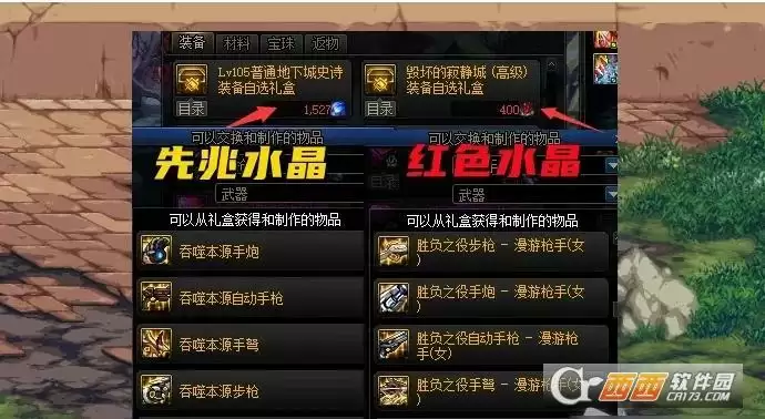 【红色水晶用途】:400个红色水晶兑换105自选史诗礼盒,但需要注意,这里的自选史诗和上面先兆水晶兑换的史诗有所不同,比如,先找水晶只能选择制式武器,而红色水晶可选择CP武器。