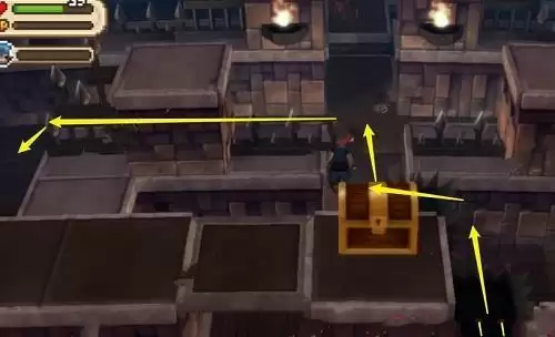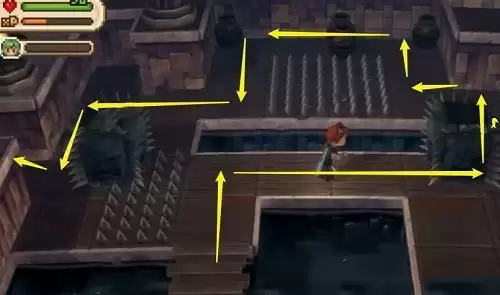 12、根据下图的路线闯过尖刺关卡,进入都是石像的房间,石像被激活后消灭所有石像(正面攻击石像不会受到任何伤害,需要从侧面或者背后攻击),打开向前闯关的门。