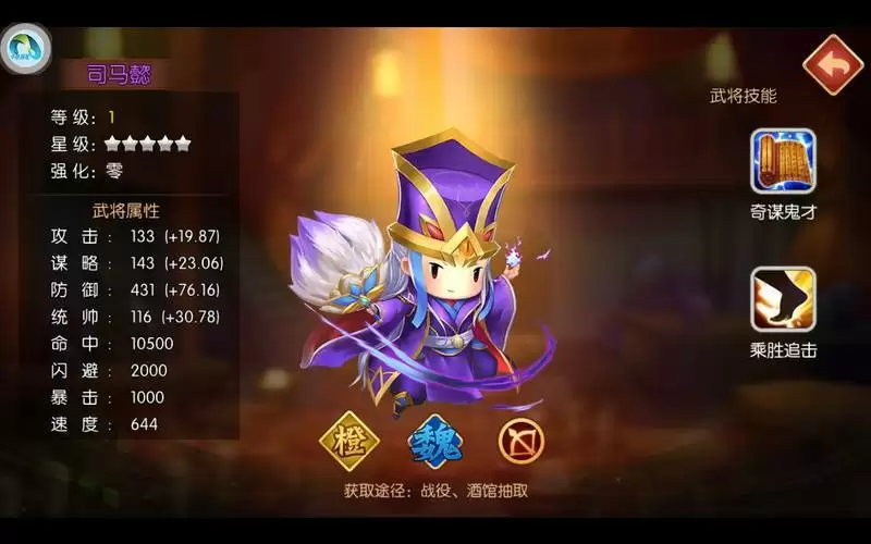 司马懿这个武将不强烈推荐,毕竟神司马懿还算好培养,天下大事卡包有,商店有时也会出现。橙将司马懿相当于减弱版的神司马懿。技能设计都是谋略伤害型,先看第一个主动技能,10级时对2人造成1448+30%谋略伤害,提高暴击100%2回合;第二个技能10级时攻击全体1015+30%谋略伤害,提高自身技能伤害58%3回合。看技能设计也是很强大的谋略输出,在没有强力神司马懿时,这个也是不错的选择。