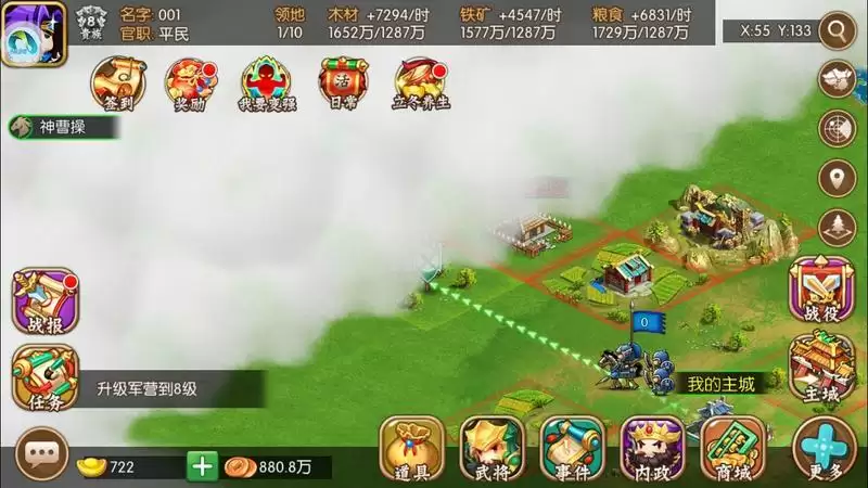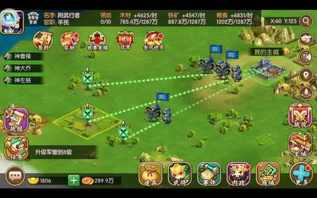 《萌军天下》野外地图是自由度比较高的,虽然也采取了常见的田字格模式的地块,但和率土是有区别的,这里不用一块挨着一块的铺路,可以直接飞地。还有一个需要注意的,当你去攻打一个地块如果失败了,地块的敌军不会回满,这样就不用算时间去二队补刀了,按着他摩擦就是了。以后的清缴黄巾也和这个一样。每个打下来的资源地可以建造相对应的建筑,并且最高升到三级来增加地块资源产量。