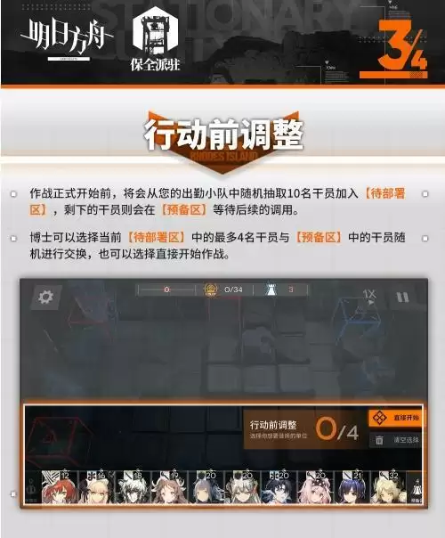 作战开始前,系统会随机在你开局选择的队伍中抽取10名干员加入待部署区,剩下的干员则会在预备区等待后续的使用,也可以使用地方掉落的调用凭证让备选区的干员进入待部署区,还是要记得待部署区有10个干员的上限,满员后的干员只能进入休息区,记得主要分配,不要卡住干员的部署格子。