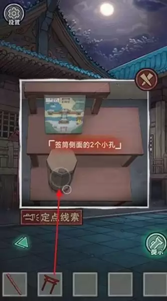 10、去右边探索,得到【木牌鸟居】,将鸟居放到签筒里,获得【半截竹签】,把两个竹签合成后对拜殿的钱箱下使用,获得【金属钥匙】,打开去走廊的门。