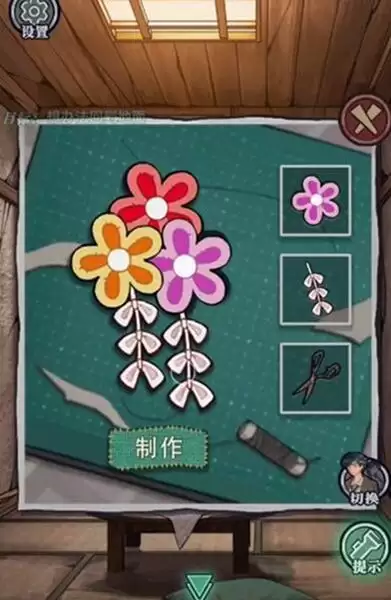 17、用火柴点燃右下角的蜡烛,按照下图的样子点击门上的机关,打开门在桌上获得【针线】,在纸扇子谜题下面使用针线,在右下角装上拉链头获得【木制钥匙】。